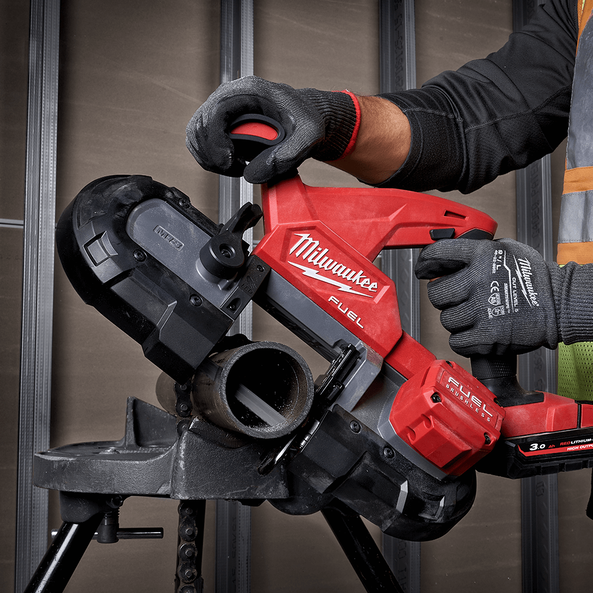 Our M18 FUEL™ Compact Band Saw offers a light-weight, balanced design with the cutting capacity of 82.6mm for maximum productivity. The M18 FUEL™ Compact Band Saw utilises POWERSTATE™ Brushless motor and Constant Power Technology to cut at maximum speed. It protects your tool from drops and debris with a proprietary composite material and crush zone barriers to absorb impacts. REDLITHIUM™-ION Battery Technology (not included) provides more run-time through superior pack construction, electronics, and more work per charge over the life of the battery than any competitive lithium-ion battery on the market. REDLINK™ PLUS Intelligence has the most advanced system of cordless power tool electronics, providing you with optimised performance, electronic clutch, and overload protection using total system communication between tool, battery, and charger. The compact band saw features a tool-free locking adjustable shoe that can adjust from an extended shoe to no shoe in seconds. The band saw also includes a hanging hook for easy storage in-between cuts, variable speed trigger, LED light to illuminate your cutting area, superior cut visibility, and balanced body design.