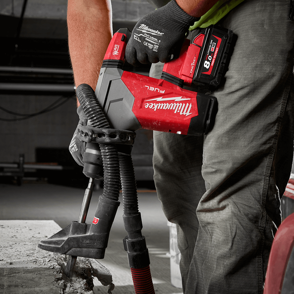 The M18 FUEL™ 28mm SDS Plus Rotary Hammer with ONE-KEY™ delivers fast drilling, hard hitting performance and maximum control for productivity on the jobsite. Designed to achieve top performance with only moderate pressure, the rotary hammer is compatible with all M18™ REDLITHIUM™ batteries, and is optimised for use with M18™ REDLITHIUM™ HIGH OUTPUT™ 8.0Ah batteries (sold separately). The POWERSTATE™ Brushless Motor delivers users 4.9 J of impact energy, 800 RPM, and 4,600 BPM, providing speed and power in the most demanding applications. REDLINK™ PLUS Intelligence tool technology ensures maximum rotary drill performance and protects the tool from overload, overheating, and over-discharge. The MILWAUKEE® M18 FUEL™ 28mm SDS Plus Rotary Hammer with ONE-KEY™ includes AUTOSTOP™ Kickback Control for maximum control and enhanced safety, with the tool sensing a bind-up situation when users are drilling in rebar or hard aggregate and stopping over-rotation, without the need for the user to release the trigger, indicated by the AUTOSTOP™ Indicator LED. The Anti-Vibration System (AVS) minimises vibration for maximum comfort when in use for extended periods. A Dedicated Dust Extractor (M18FDEX) is also available (sold separately), which once connected is powered by the Rotary Hammer. With ONE-KEY™ technology, users also gain the ability to customise, track and manage the tool.