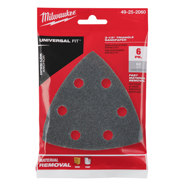 The Universal Fit OPEN-LOK™ Triangle Sandpaper is designed for Oscillating Multi-Tools. The triangle sandpaper utilises hook and loop technology for you to make fast and secure paper changes. The universal dust extraction hole placement allows for use with most dust extraction systems. The long-lasting silicon carbide grit is ideal for wood and paint. This MILWAUKEE® sandpaper works with any Triangle Sanding Pad with hook & loop technology.