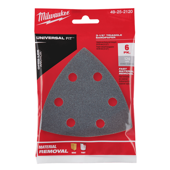 The Universal Fit OPEN-LOK™ Triangle Sandpaper is designed for Oscillating Multi-Tools. The triangle sandpaper utilises hook and loop technology for you to make fast and secure paper changes. The universal dust extraction hole placement allows for use with most dust extraction systems. The long-lasting silicon carbide grit is ideal for wood and paint. This MILWAUKEE® sandpaper works with any Triangle Sanding Pad with hook & loop technology.
